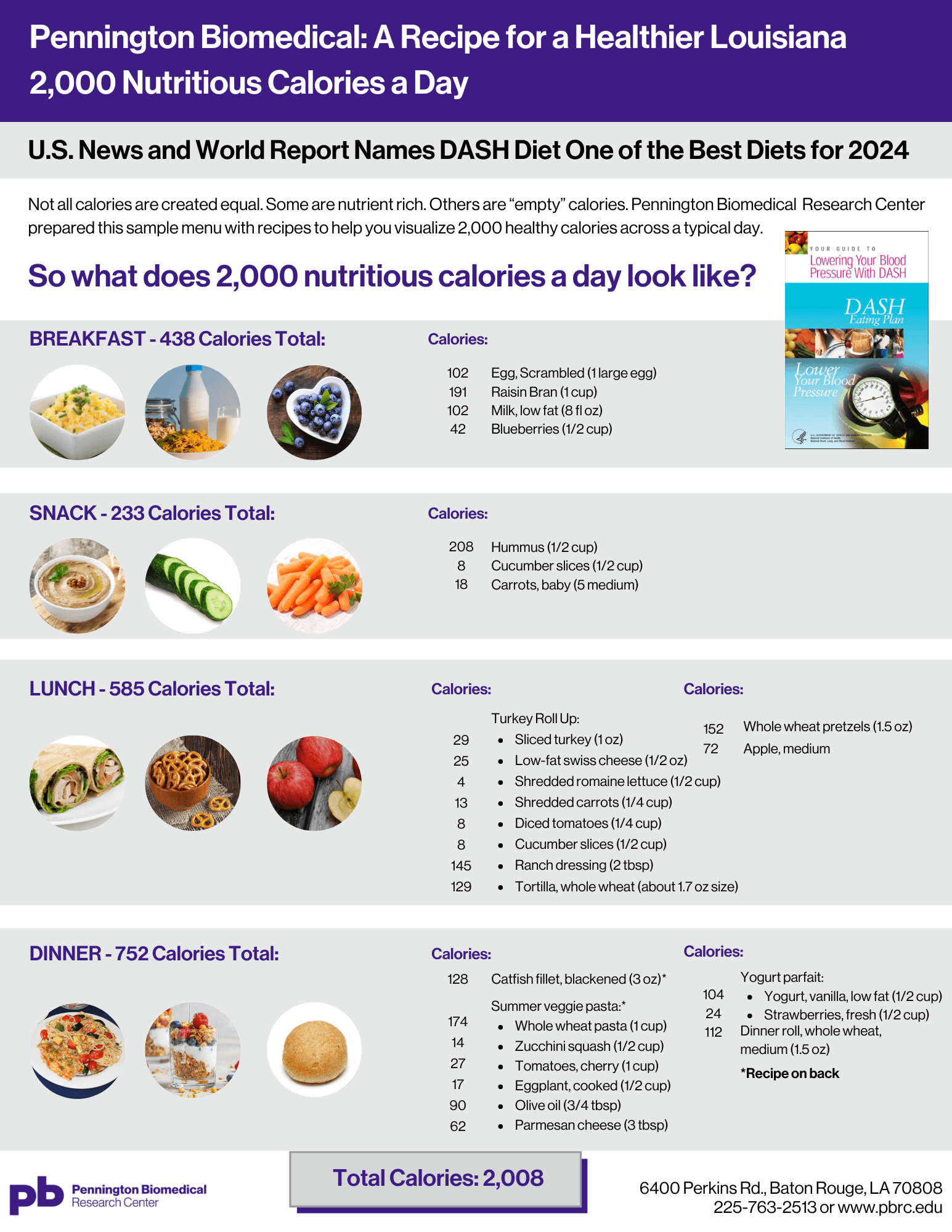 Pennington Biomedical prepared a sample menu to help you visualize 2000 calories in a given day: