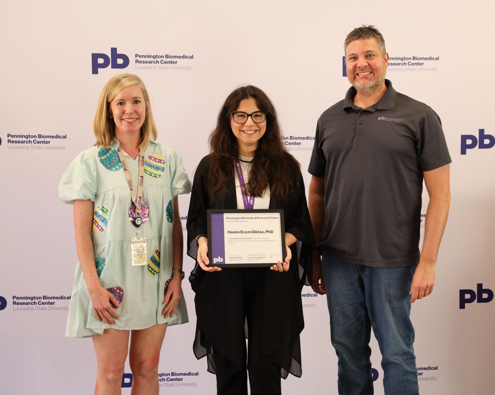 Dr. Hanim Ecem Diktas, a postdoctoral researcher in Pennington Biomedical’s Ingestive Behavior, Weight Management and Health Promotion Laboratory, has been named the Center’s Outstanding Postdoctoral Fellow for 2025. Nominated by Dr. Corby Martin and Dr. John Apolzan, Dr. Diktas has quickly distinguished herself through a strong record of scholarly achievement, including 11 peer-reviewed publications, 22 abstracts and poster presentations, and service as a peer reviewer for five scientific journals.